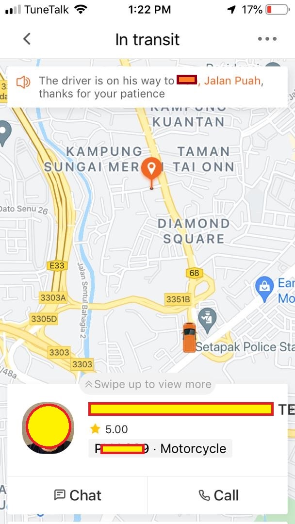 Di bahagian info rider/driver itu terdapat nama, nombor plat kenderaan serta rating rider/driver berkenaan.. Anda boleh lihat pada peta di mana lokasi rider/driver pada waktu ini. Terdapat butang chat & call jika anda ingin menghubungi mereka. Daripada peta berkenaan, anda boleh jadikan panduan untuk melihat sekiranya rider/driver ini nanti sampai ke kawasan tempat anda untuk pickup barang