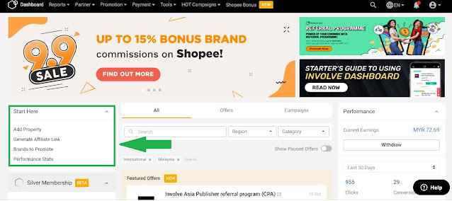 Setelah berjaya mendaftar, anda boleh login masuk melalui akaun anda. Jika anda lihat pada laman di bawah, terdapat banyak 'tab' yang boleh anda klik dan 'explore'. Bagi ruangan yang saya petakkan, di situ anda boleh untuk masukkan maklumat property anda, nak 'generate' link affilate, senarai brand-brand yang boleh anda promosikan dan juga prestasi link yang anda promote